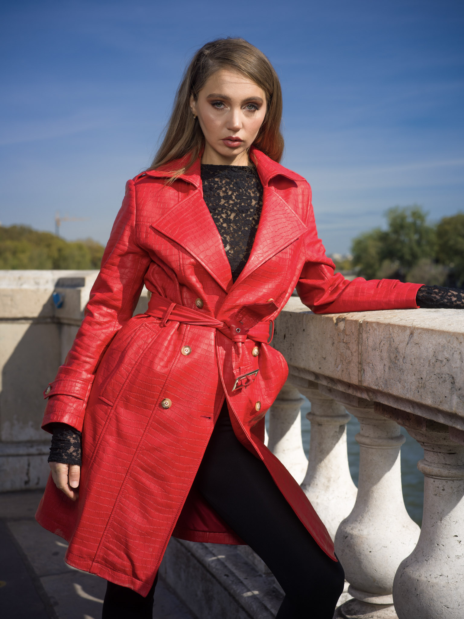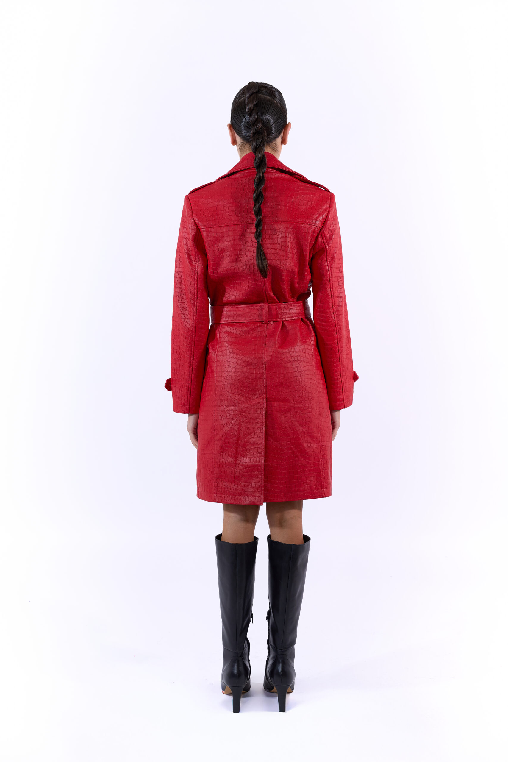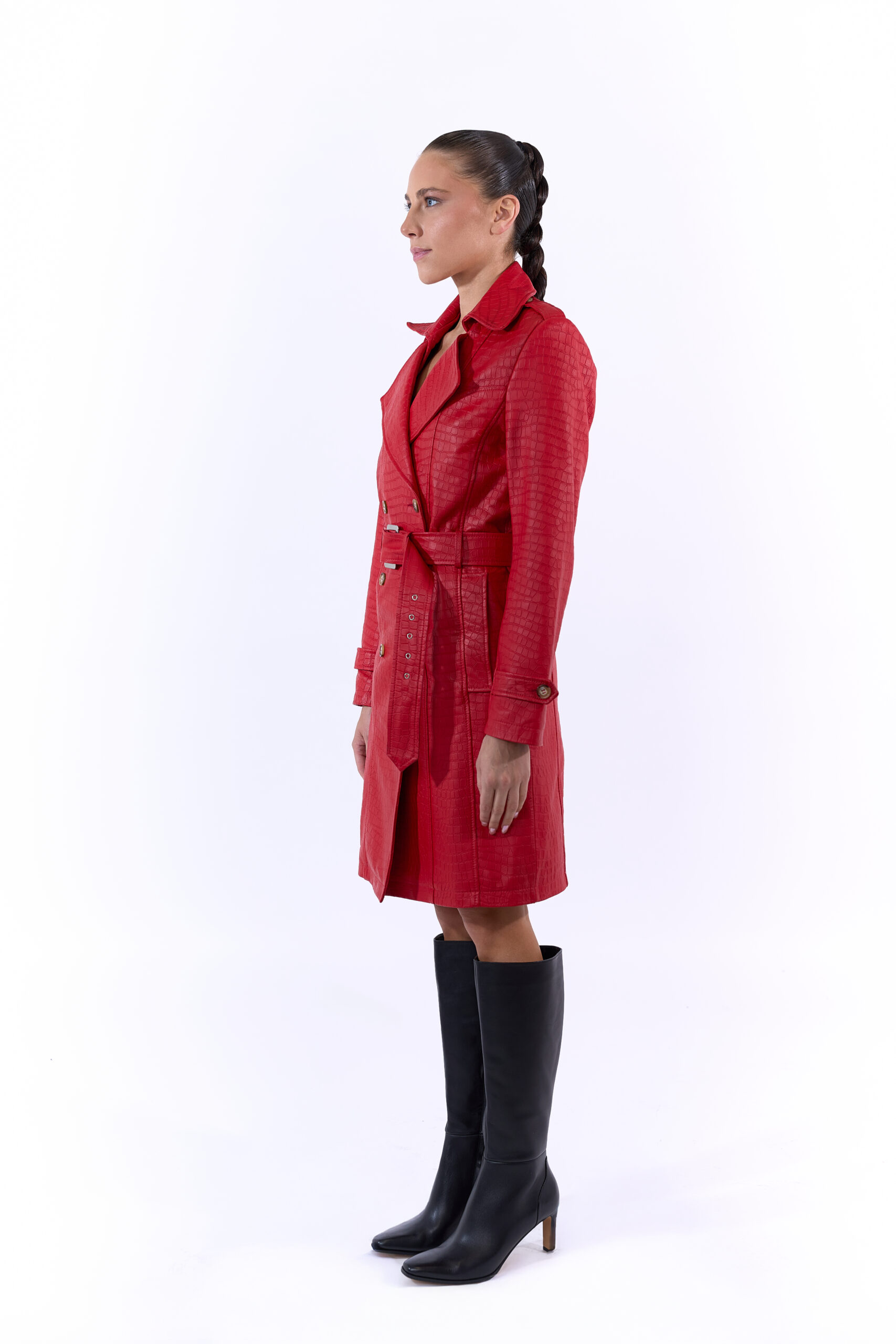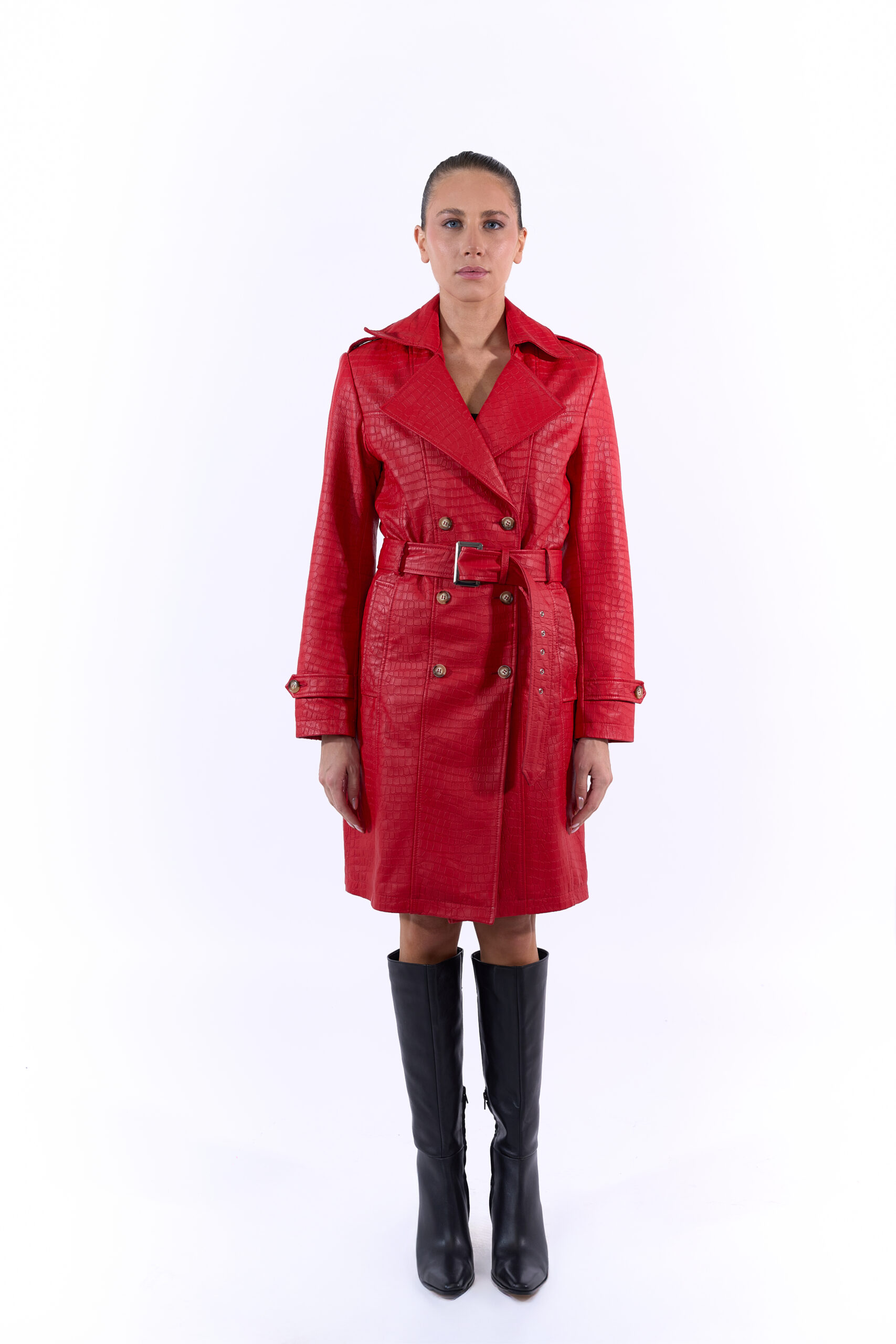 For inquiries, ordering and pricing please contact us at: info@rajeevfernando.com- A bold, high-fashion croc-embossed leather trench coat designed for statement wear. Features a sleek longline silhouette, structured shoulders, and premium faux-croc texture. This trench delivers standout style with a luxurious finish, available in three vibrant color options.