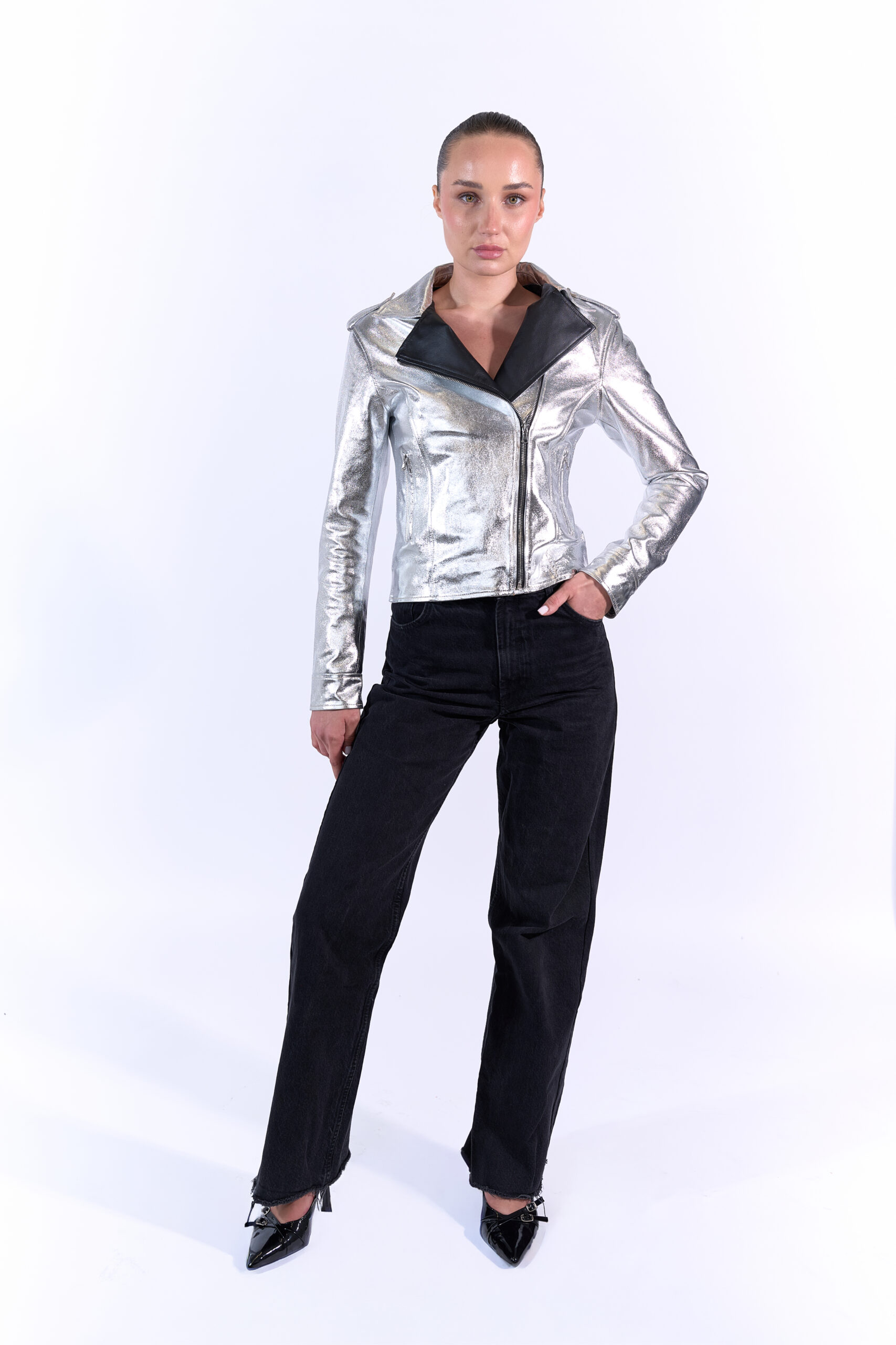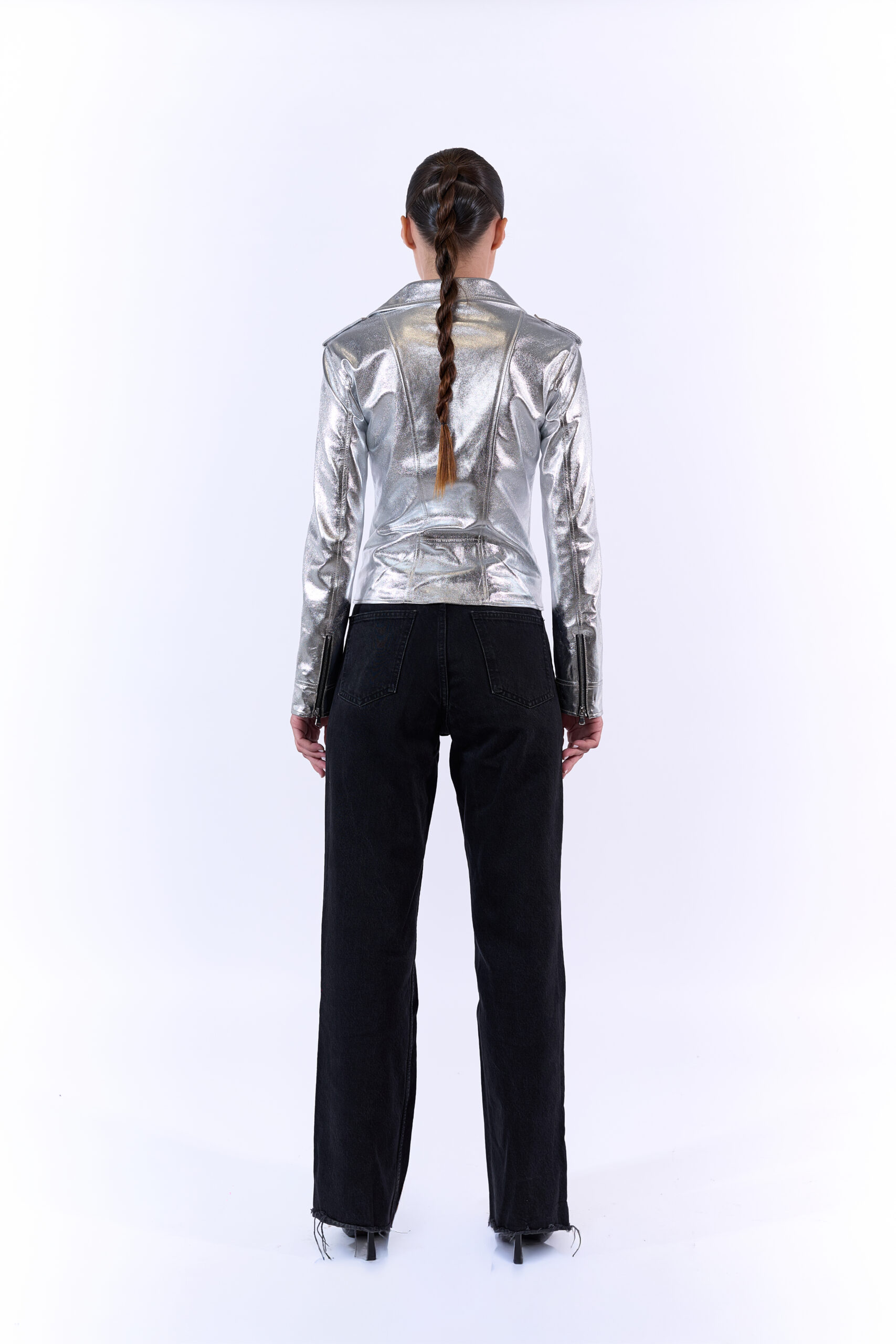 For inquiries, ordering and pricing please contact us at: info@rajeevfernando.com- A short, modern leather jacket featuring a metallic silver finish. Designed as a half-length cut, this piece adds edge to any outfit with its sleek profile and eye-catching shine. Perfect for styling with both casual and fashion-forward looks.