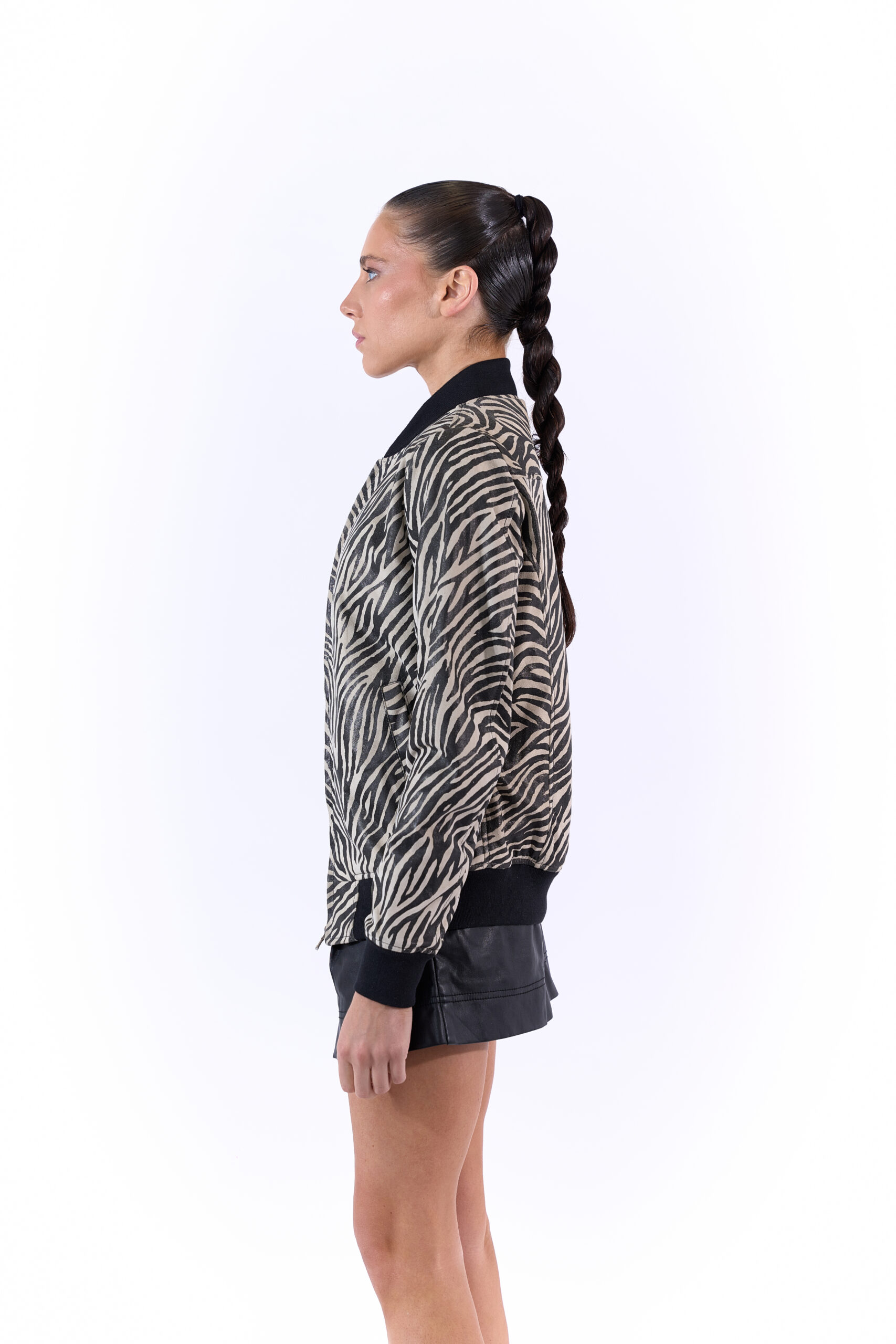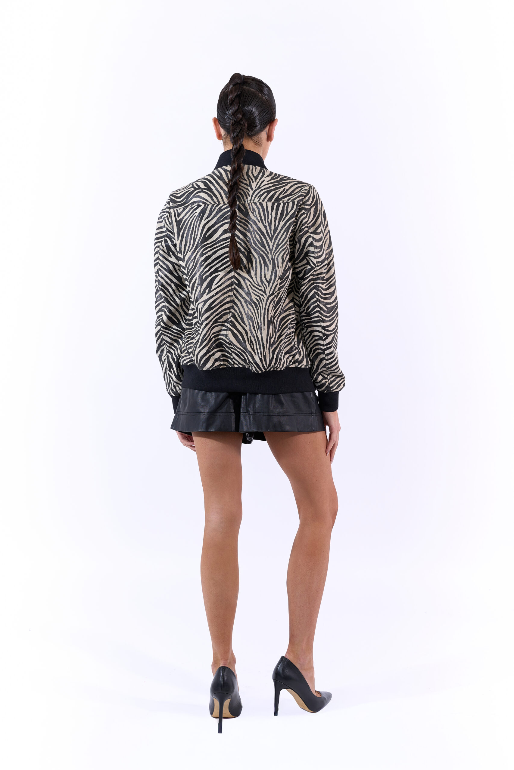 For inquiries, ordering and pricing please contact us at: info@rajeevfernando.com- A striking suede jacket featuring a high-contrast black and white zebra print. The soft suede texture combined with the wild pattern creates a daring, trend-setting outerwear option perfect for making an impression.