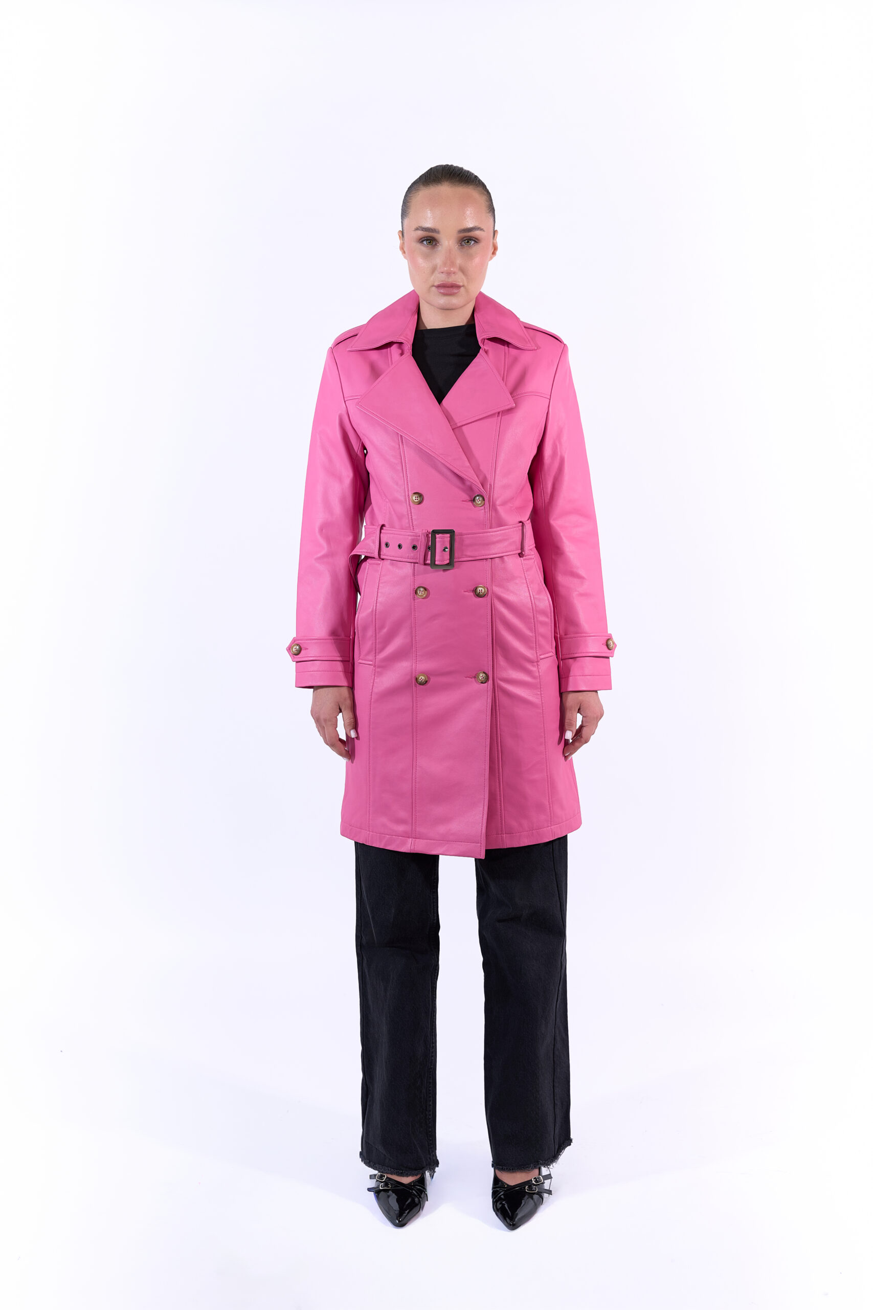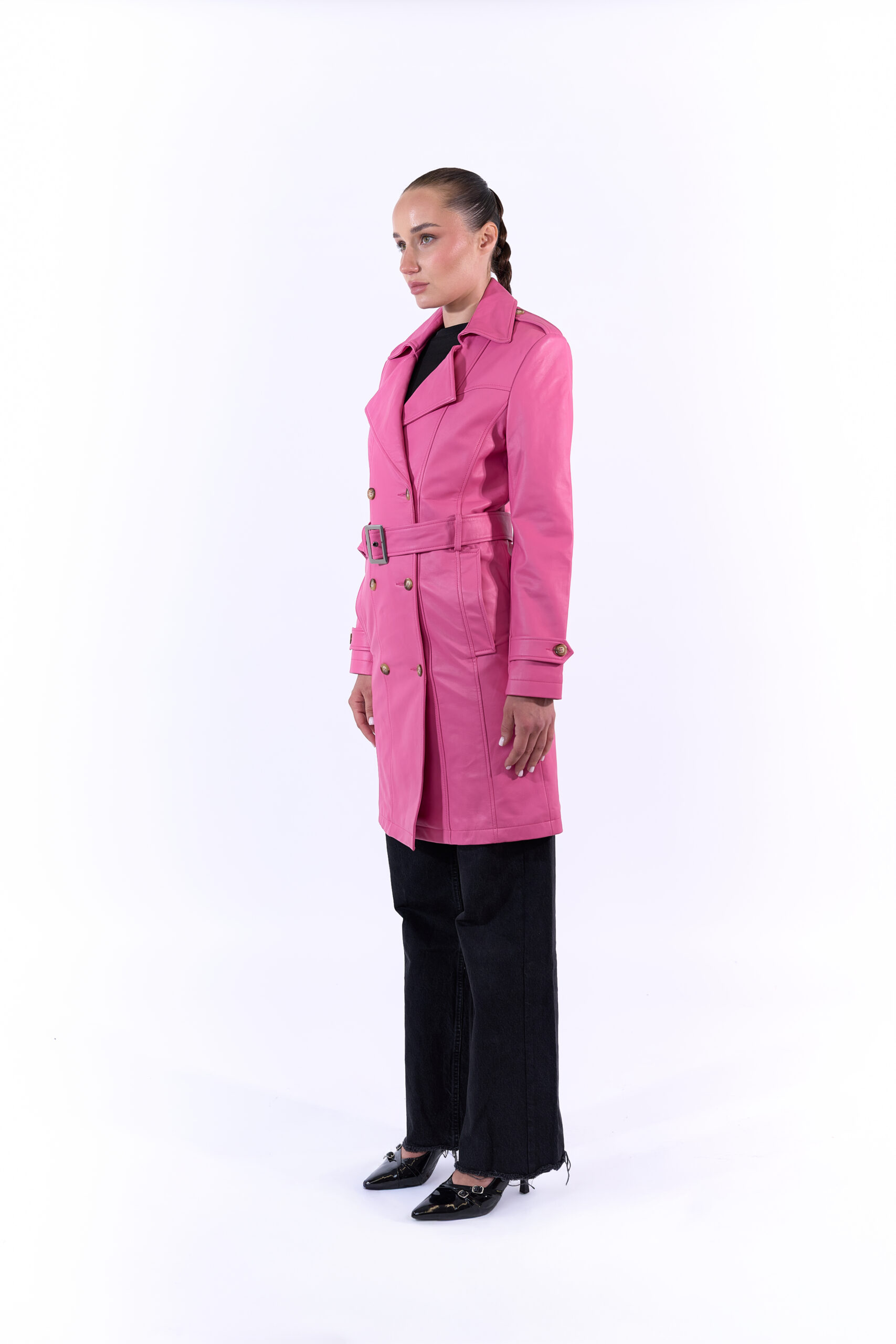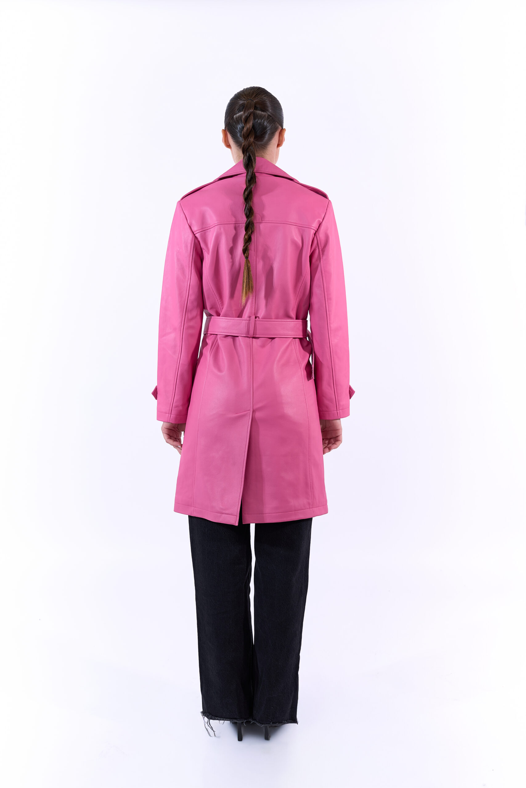 For inquiries, ordering and pricing please contact us at: info@rajeevfernando.com- A classic full-length leather trench coat crafted for elegance and versatility. The smooth leather finish offers a refined look, while the tailored cut enhances shape and comfort. Available in a bright pink option and a green version accented with stylish black trim.